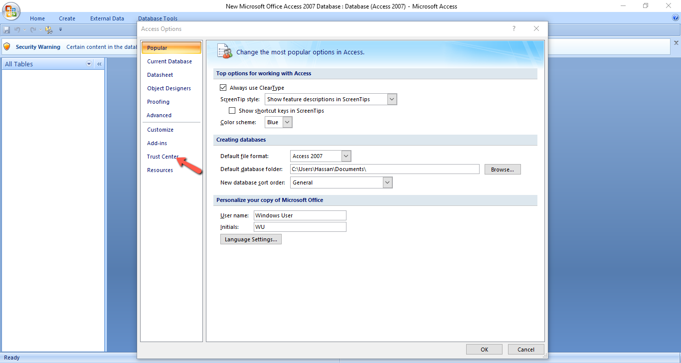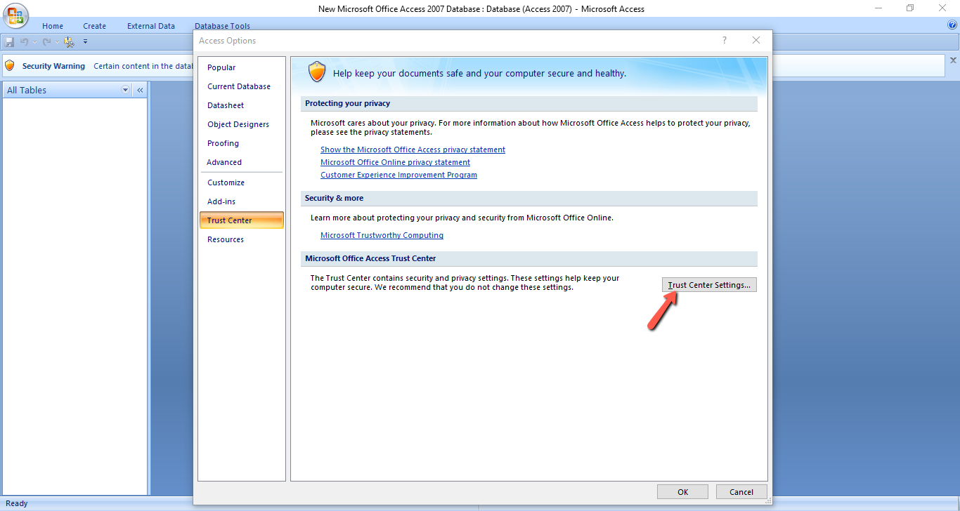 - Then click "Trust Center Setting" button as shown above. Another window will open as shown below.